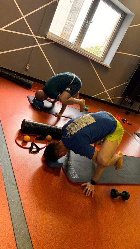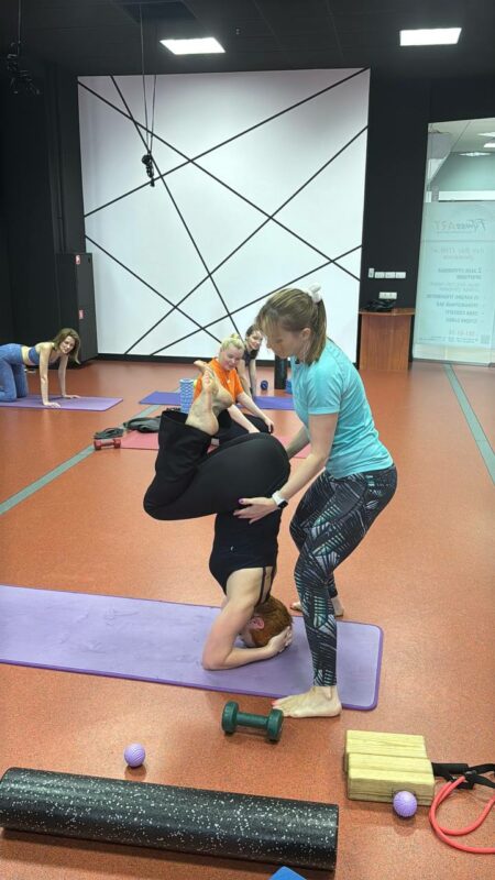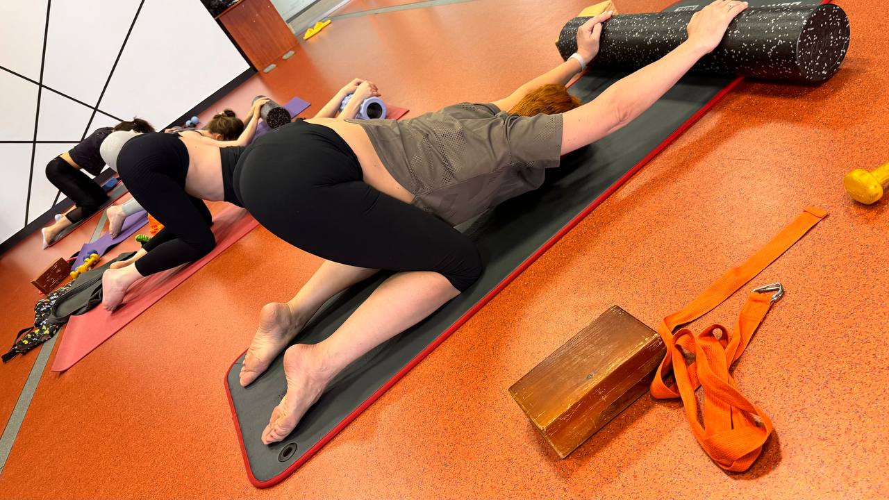 — В конце занятия, работа с полусферми по типу МФР (мио- фасциальное расслабление). Обязательно шавасана (мягкое расслабление тела)